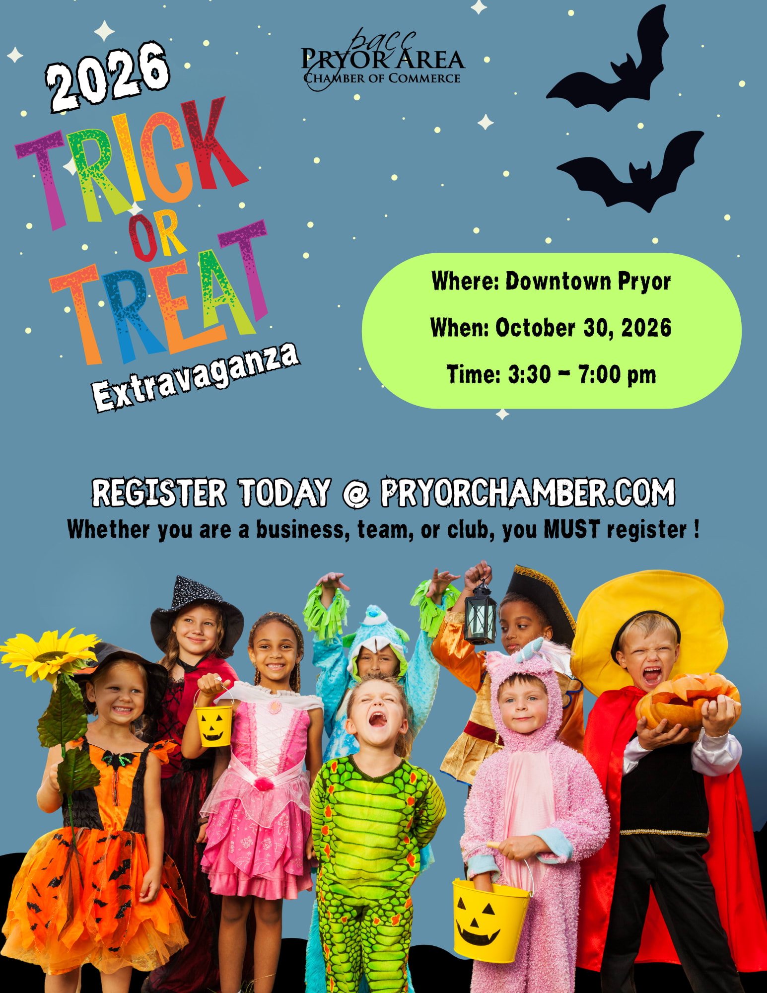 Trick or Treat with our businesses throughout Pryor's Downtown & the Main Street District this Halloween! Pryor's Downtown Trick-or-Treat event will be held on Friday, October 30th, from 3:30 PM to 7:00 PM. South Adair and east Graham to Vann Street will be blocked to traffic, and candy stations will be set up by businesses not located in the Main Street District. *All businesses are responsible for providing their own candy and decorations.*